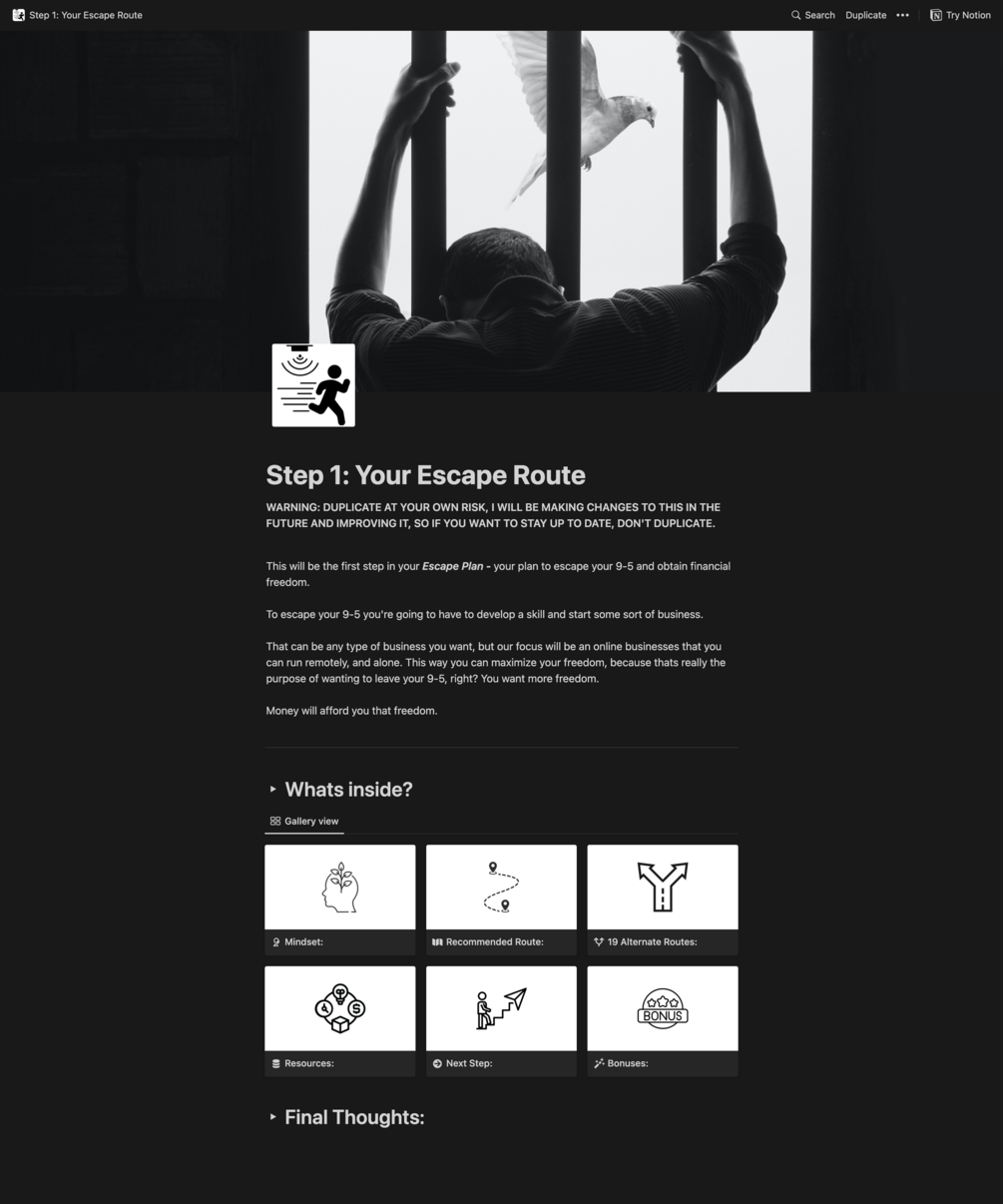 So if you're ready to take the first step towards digital freedom and break free from the 9-5 grind, Your Escape Route is the perfect resource for you.